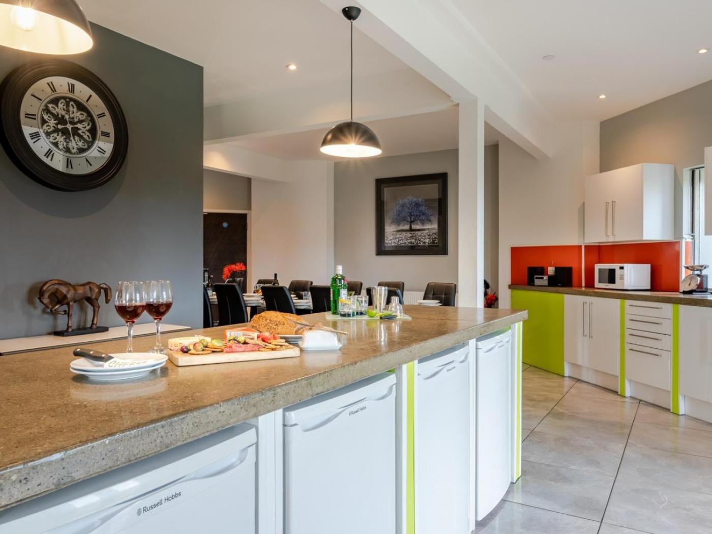 Nine-Bedroom House. The holiday home features 9 bedrooms, 6 bathrooms and a kitchen. The well-fitted kitchen has a dishwasher, kitchenware and an oven. The holiday home provides a TV, a washing machine, a high chair for children, heating as well as garden views. The unit offers 14 beds.