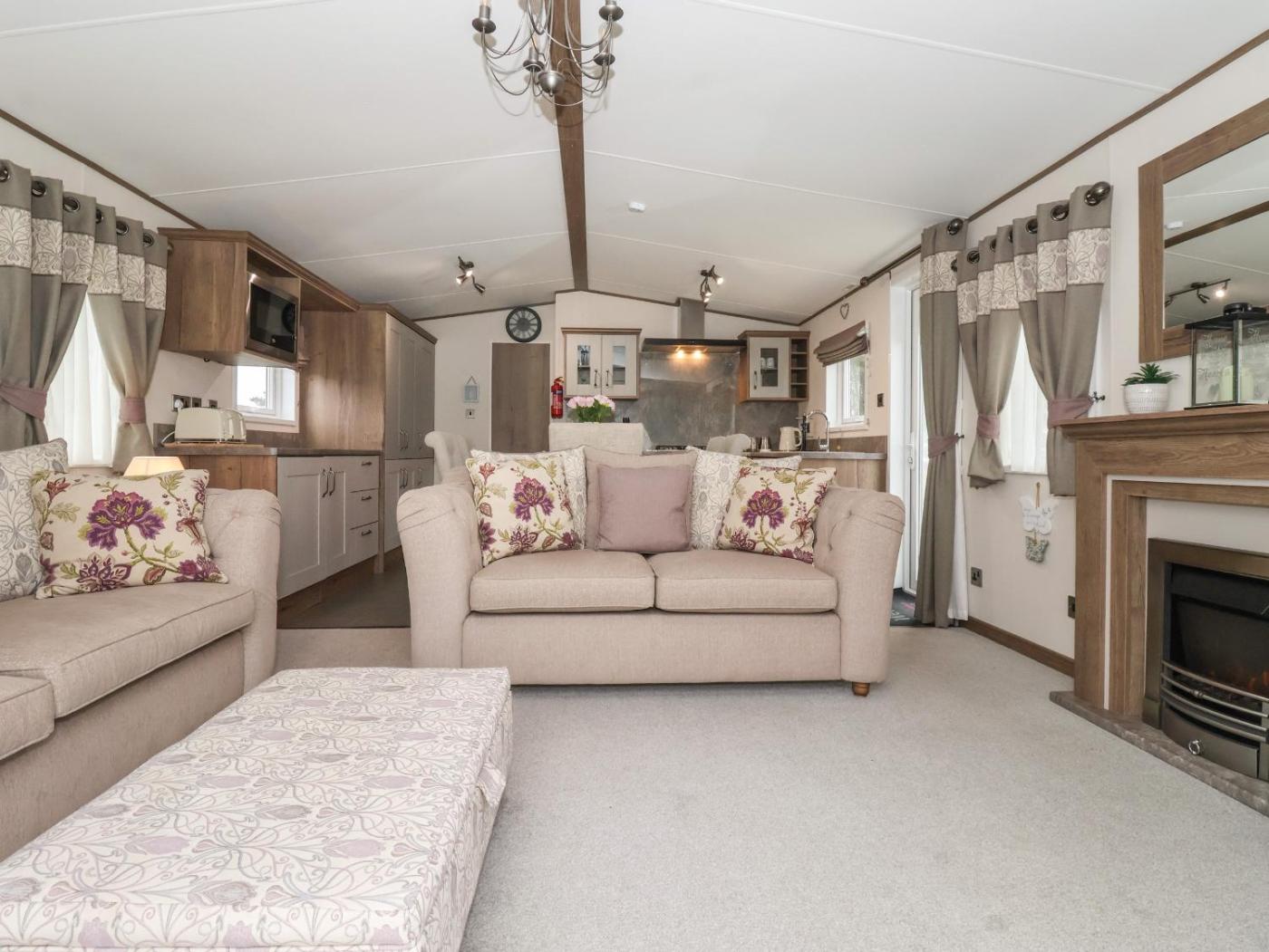 Holiday Home. The fireplace is the standout feature of this holiday home. This holiday home comes with 2 bedrooms, a seating area with a sofa and 2 bathrooms with a walk-in shower. The fully equipped kitchen has a stovetop, a refrigerator, a dishwasher and an oven. The holiday home features a washing machine, a dining area, a wardrobe, an electric kettle, as well as a TV. The unit has 3 beds.
